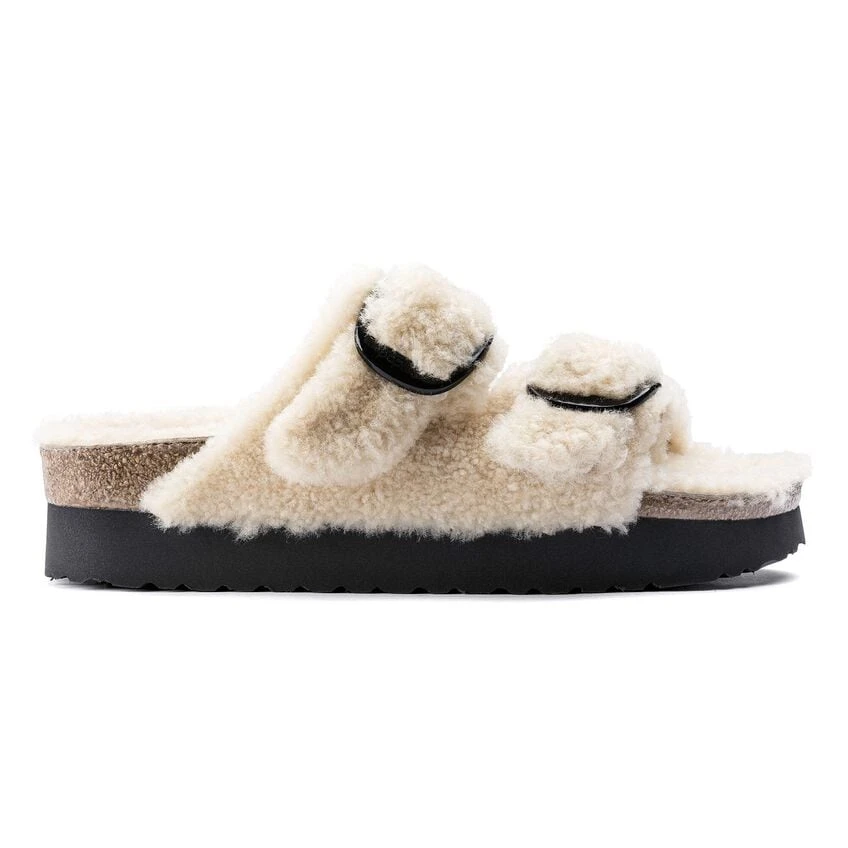 The iconic Arizona two strap sandal, now available in all over teddy shearling. Extra cozy, extra comfortable with amplified big buckles for a bold style.